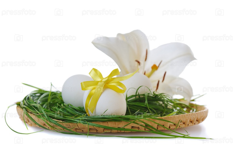 Пасхальные яйца в корзинке с белой лилией на белом фоне