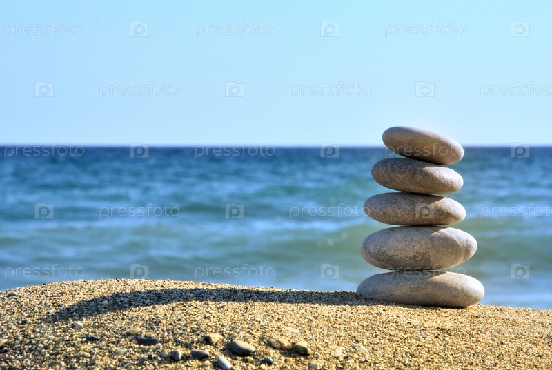 Камни балансируют на пляже голубого моря