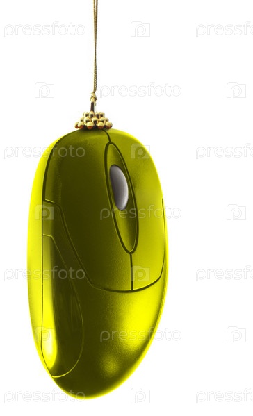 Новогоднее украшение в виде золотистой компьютерной мыши, крупный план на белом фоне