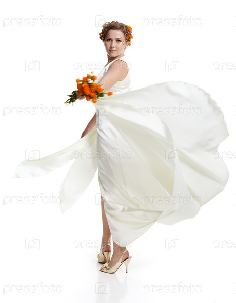 Портрет красивой девушки в белом платье с букетом цветов