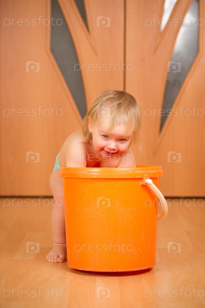 Очаровательный ребенок моет руки в ведре