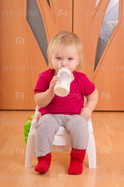 Очаровательный ребенок сидит на стуле и пьет молоко из бутылочки