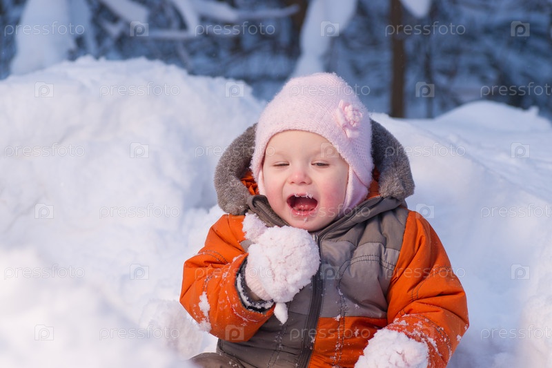 Очаровательный ребенок ест снег с рукавицы