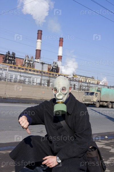 Человек в противогазе с опущенным вниз большим пальцем на фоне дымящих заводских труб