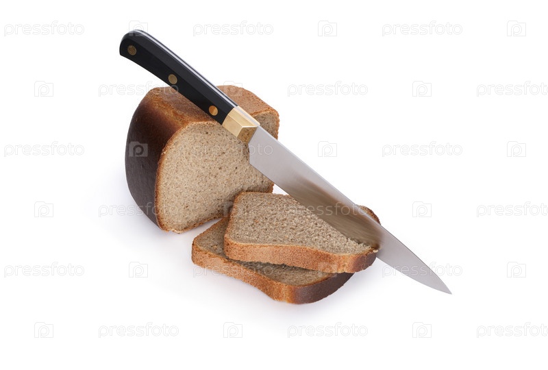 Ломтики ржаного хлеба и кухонный нож на белом фоне