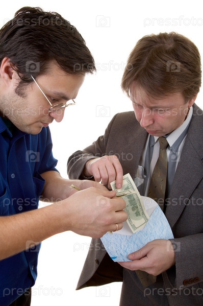 Два бизнесмена, засовывающие деньги в конверт