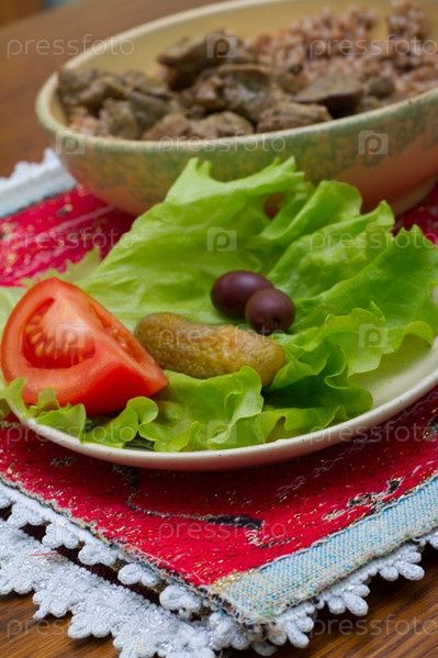 Мясо с гарниром и овощи на столе