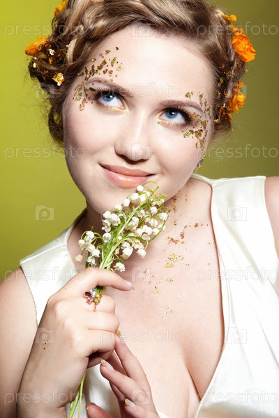 Портрет девушки в белом платье с цветами в волосах и ландышами в руках