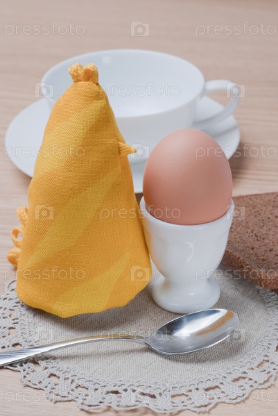 Чашка с блюдцем, яйцо и кусок хлеба на столе
