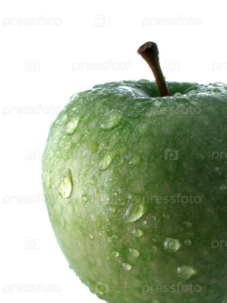 Капли воды на зеленом яблоке