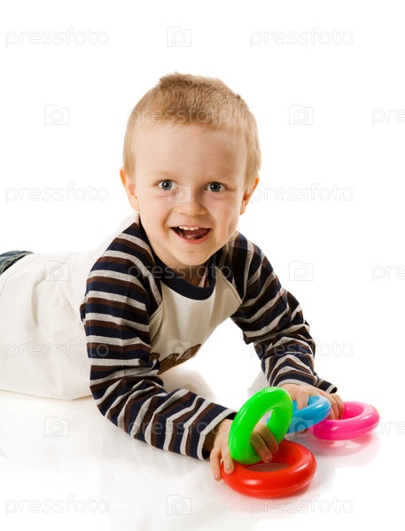 Портрет мальчика, играющего с красочными кольцами на белом фоне
