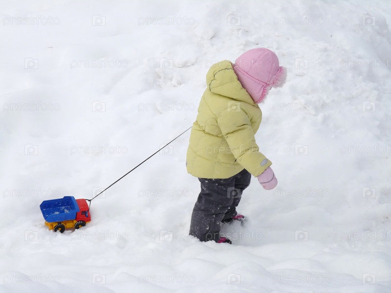 Ребенок, играющий в снегу с машинкой