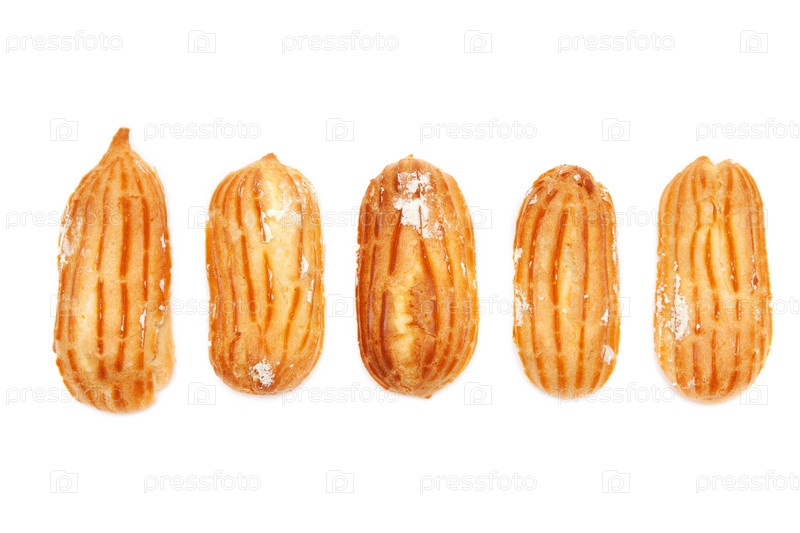 Аппетитные эклеры, расположенные в ряд на белом фоне