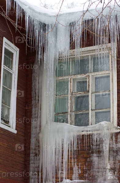 Большие сосульки у окон деревянного дома