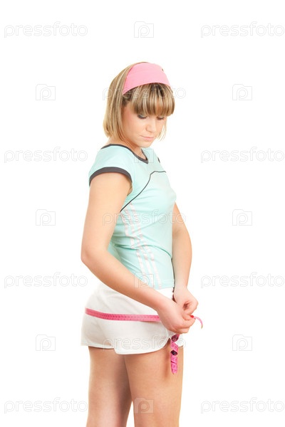 Спортивная женщина измеряет сантиметровой лентой бедра