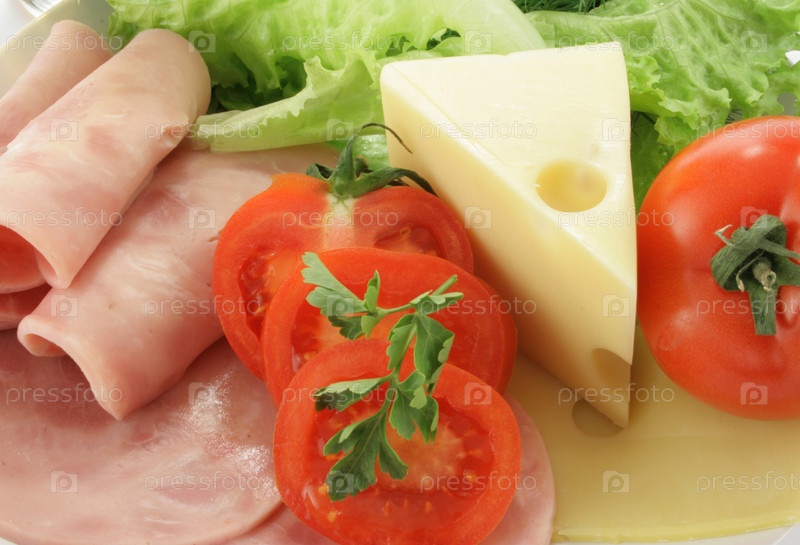 Ветчина, помидоры, сыр и листья салата крупным планом