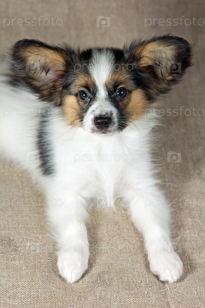 Маленький щенок породы папийон или папильон, собака-бабочка