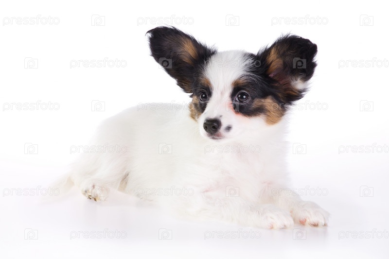 Щенок породы папийон или собака-бабочка, изолированный на белом фоне