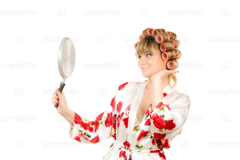 Домохозяйка в халате и бигуди смотрится в сковородку, как в зеркало