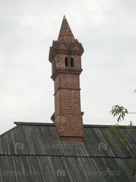 Кирпичный дымоход на деревянной крыше