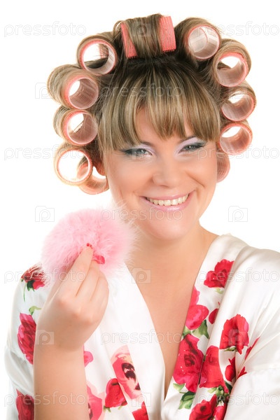 Домохозяйка в халате и бигуди с пуховкой в руках на белом фоне