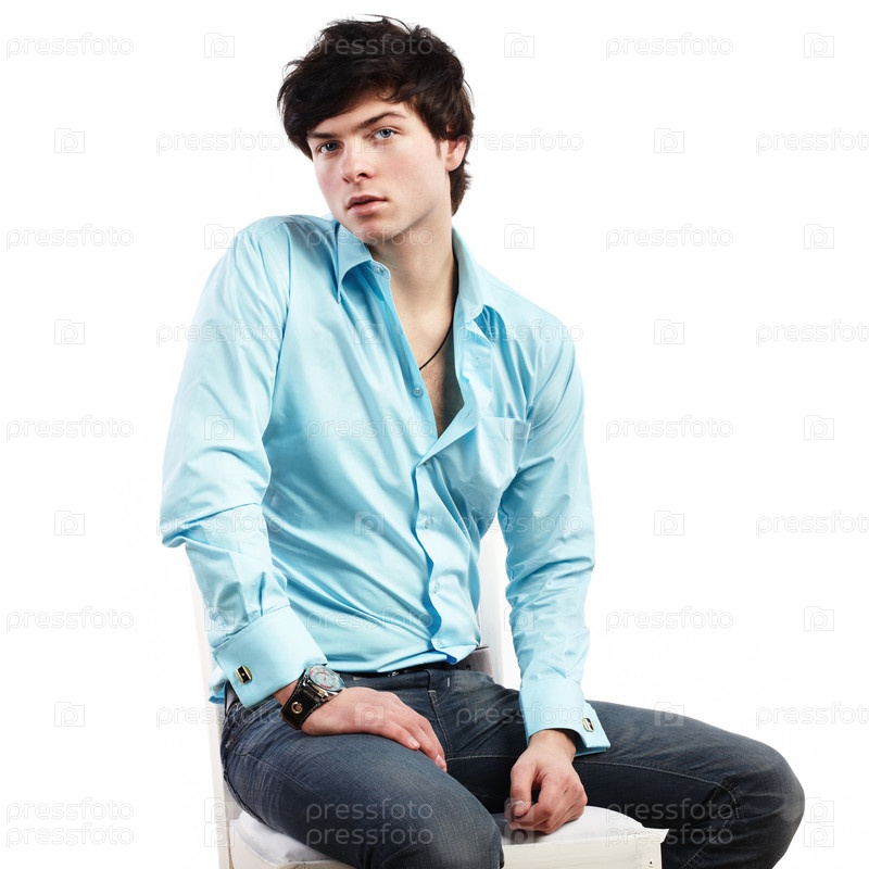 Красивый молодой человек сидит на белом фоне