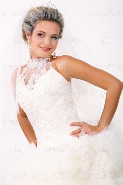 Портрет очаровательной кокетливой невесты, на белом фоне