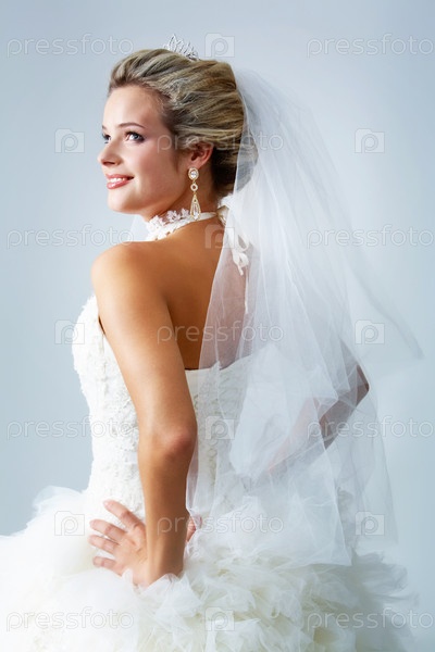 Портрет очаровательной счастливой невесты, на голубом фоне