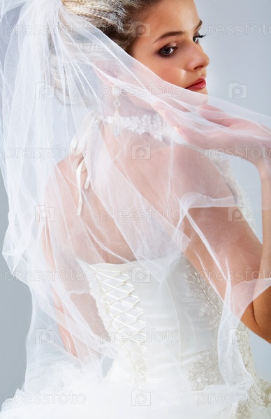 Портрет очаровательной невесты на голубом фоне