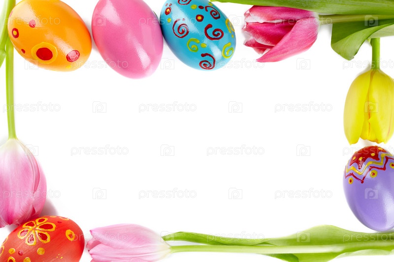 Рамка из пасхальных яиц и тюльпанов