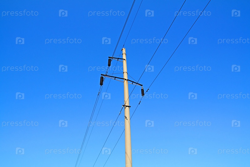 Столб с электрическими проводами на фоне голубого неба