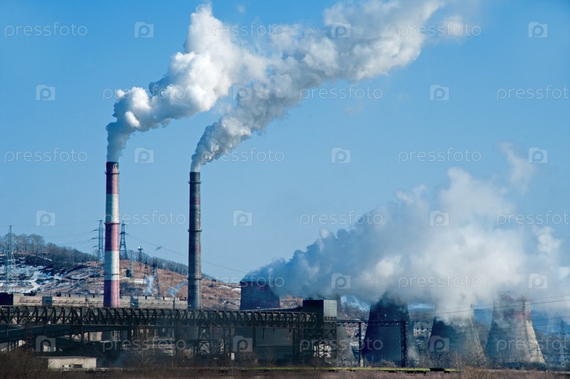 Дым, идущий из заводских труб на фоне голубого неба