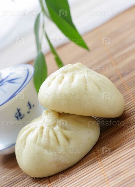 Китайский пирожок с начинкой и чашка чая крупным планом
