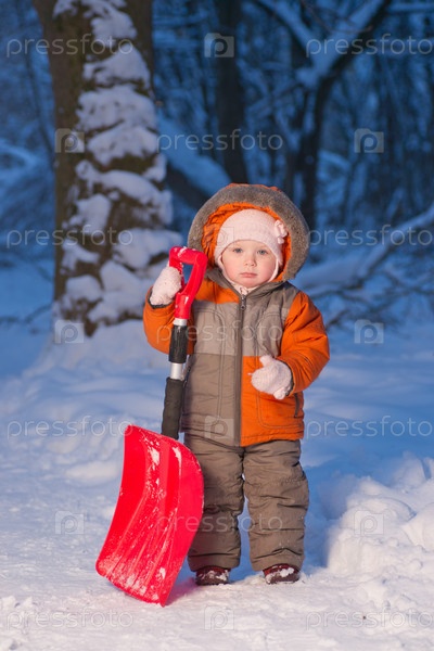 Малыш с лопатой в парке, зима