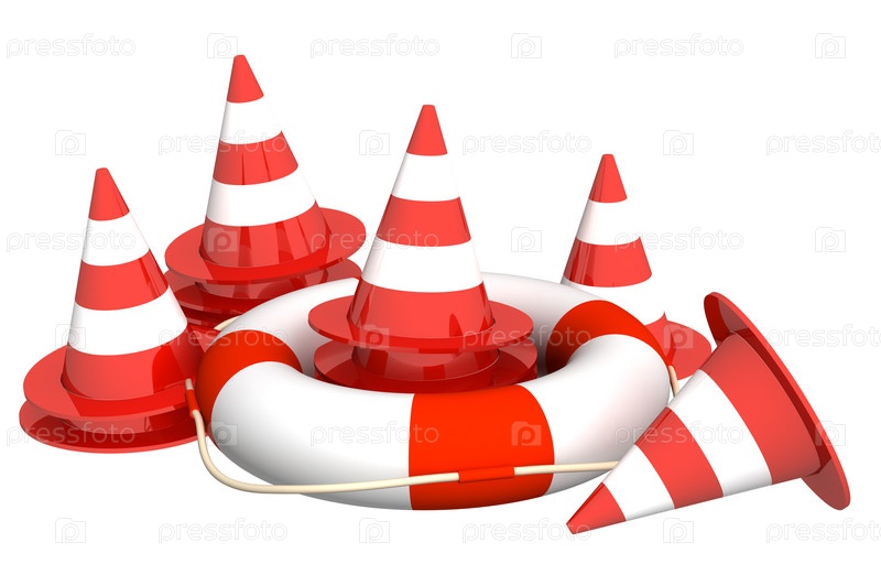 Аварийные дорожные конусы и спасательный круг на белом фоне
