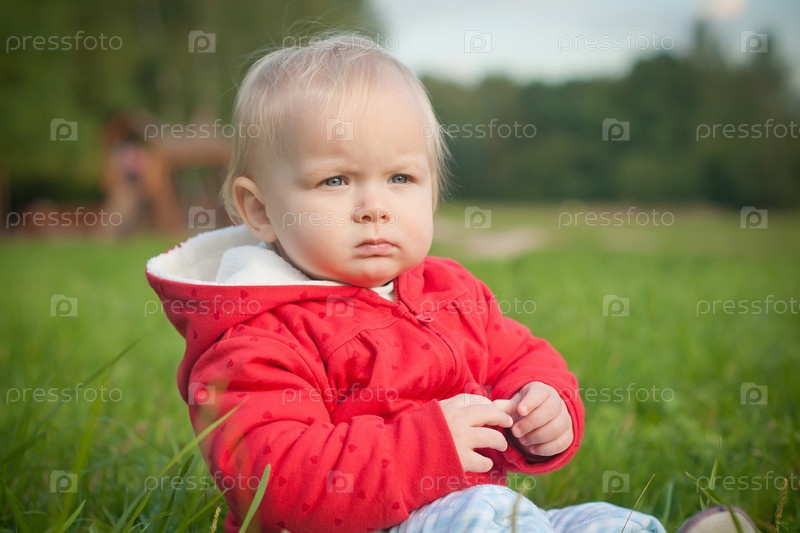 Ребенок сидит на зеленой траве