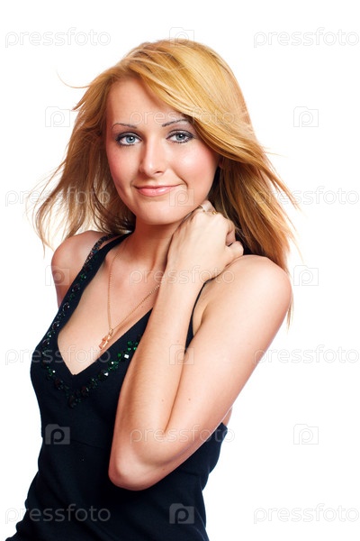 Портрет красивой блондинки с развевающимися волосами на белом фоне