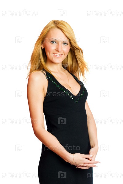 Портрет красивой блондинки с развевающимися волосами на белом фоне