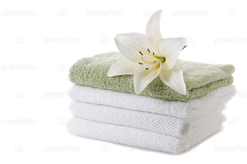 Белая лилия на стопке чистых полотенец на белом фоне