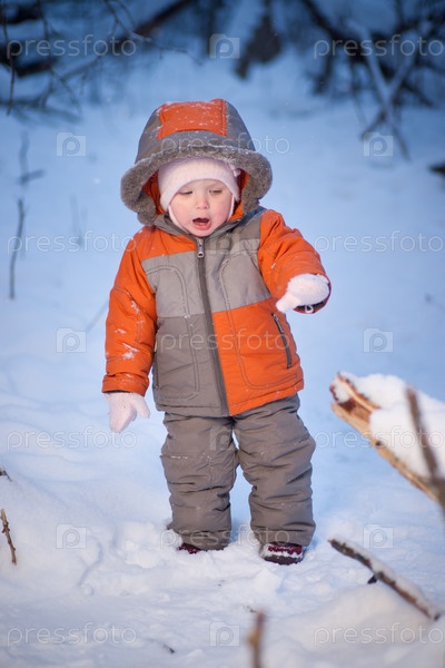 Эмоциональный ребенок в зимнем лесу, вечер