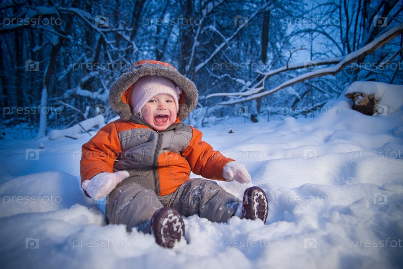 Плачущий ребенок сидит в сугробе в зимнем лесу, вечер