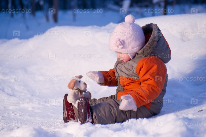 Ребенок с игрушечной собакой в зимнем лесу, вечер