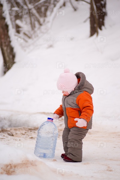 Ребенок пытается поднять бутыль с водой