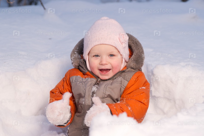 Ребенок сидит в сугробе в зимнем лесу