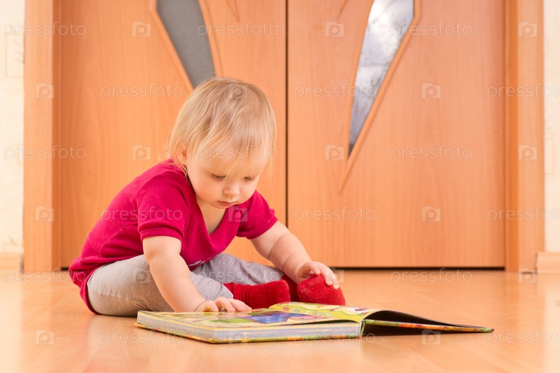 Маленький ребенок сидит на полу и читает книгу