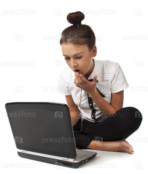 Удивленная девушка сидит на полу с ноутбуком