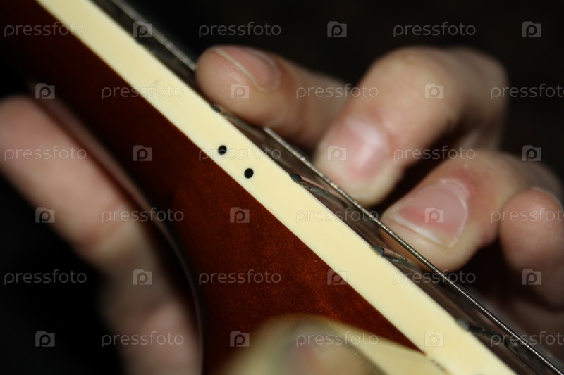 Мужские руки, играющие на гитаре на черном фоне