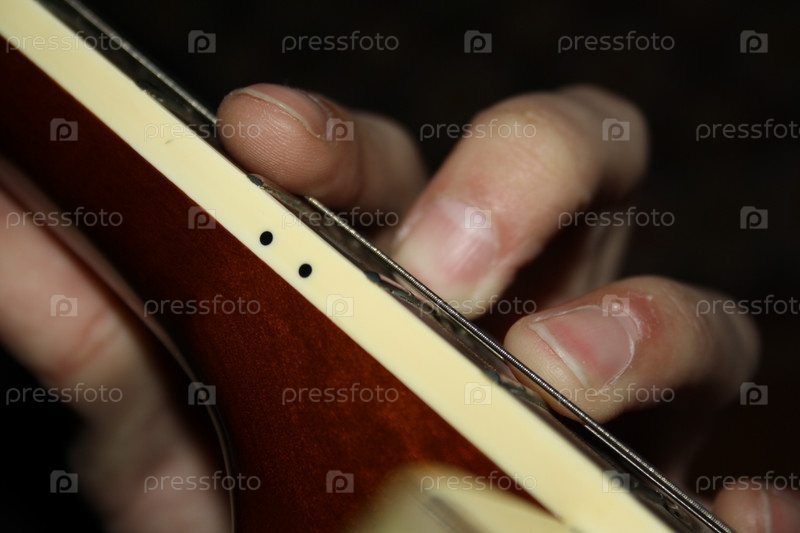 Мужские руки, играющие на гитаре на черном фоне