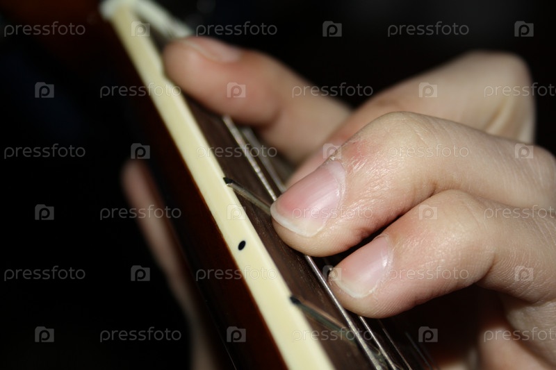 Мужские руки, играющие на гитаре на черном фоне