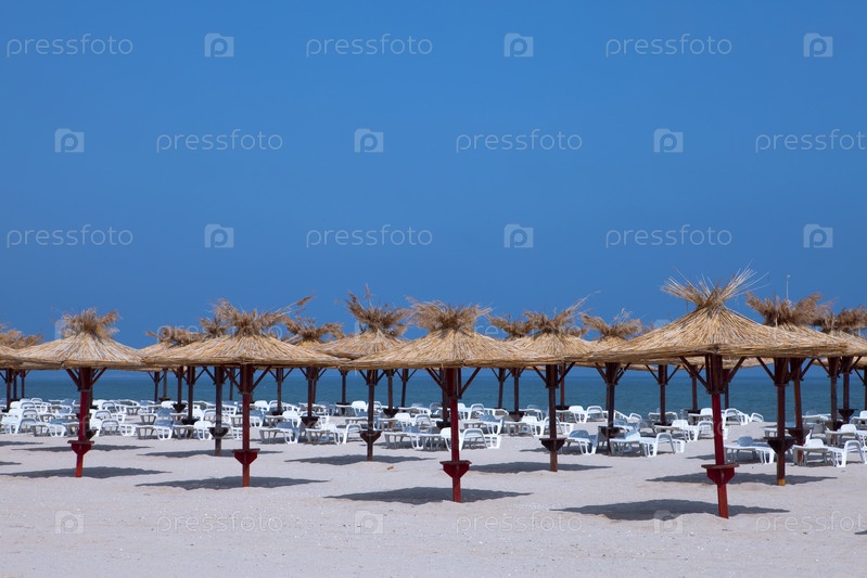 Зонтики и шезлонги на пустынном пляже